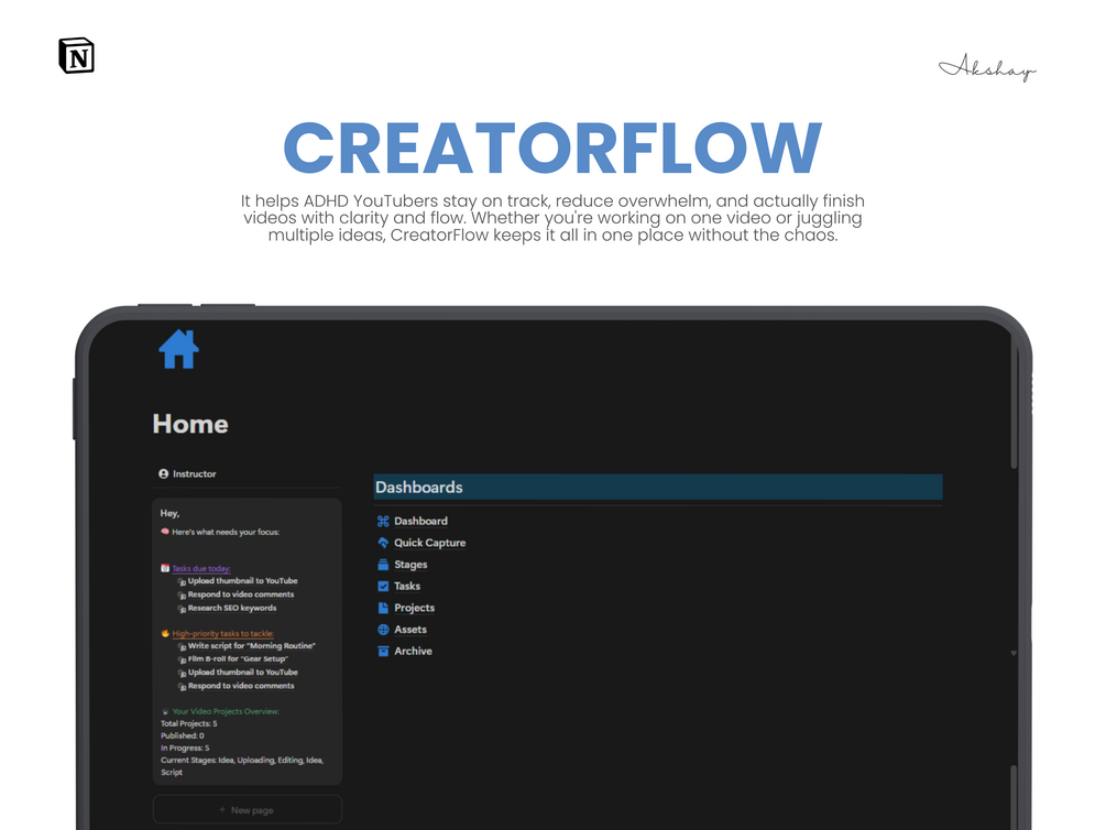 CreatorFlow™️ is a thoughtfully designed YouTube video manager for ADHD brains — built inside Notion. It helps ADHD YouTubers stay on track, reduce overwhelm, and actually finish videos with clarity and flow. Whether you're working on one video or juggling multiple ideas, CreatorFlow keeps it all in one place without the chaos.
