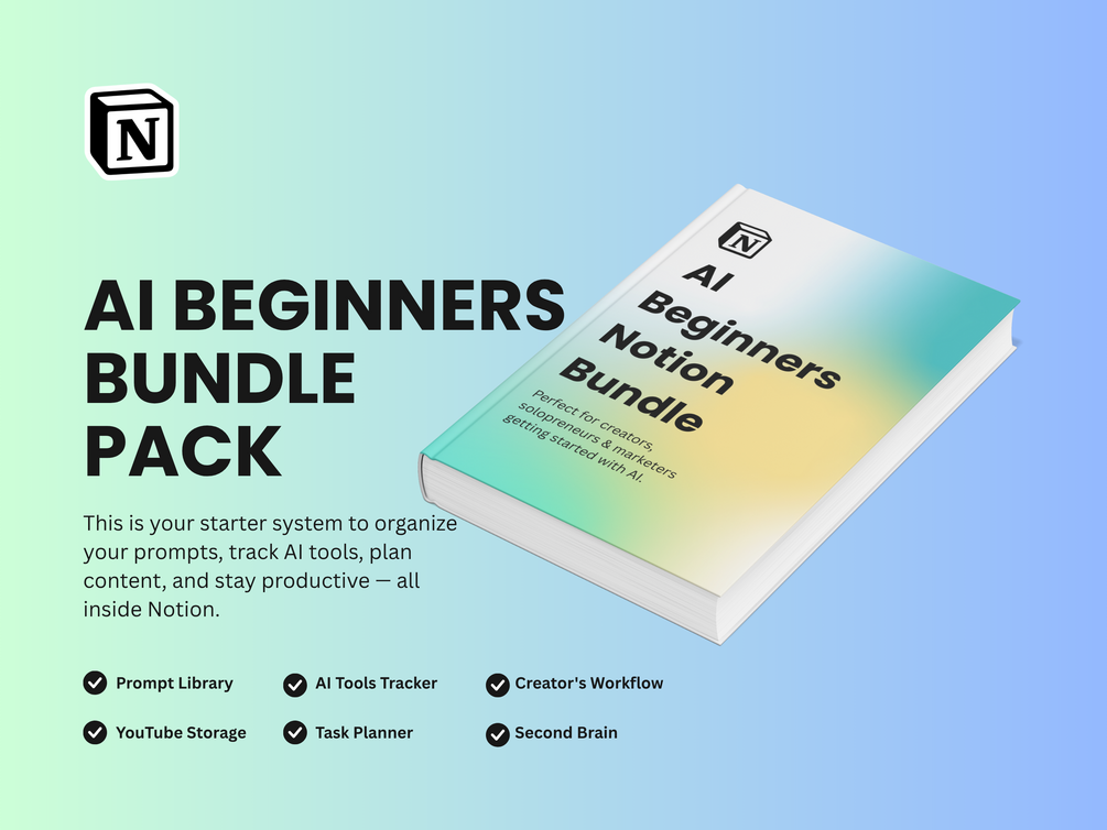 A powerful all-in-one Notion setup made for AI beginners, creators, solopreneurs, and marketers using tools like ChatGPT, Midjourney, Notion AI, and more.