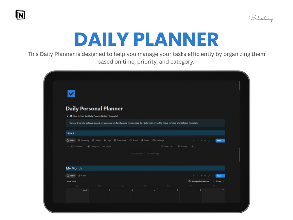 The Personal Daily Planner Notion Template™️ is a simple yet powerful digital planner designed to help you stay focused, fight procrastination, and manage your work-life balance with ease. Built inside Notion, this planner acts as your all-in-one space to plan tasks, track your habits, journal your thoughts, and build daily momentum—without getting distracted.