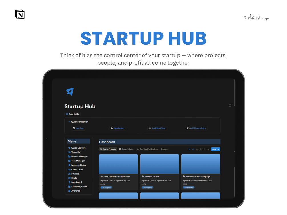 Startup Hub Notion Template™️ is your all-in-one workspace for small startups and teams — built to manage everything from projects, clients, and team tasks to finance tracking and goal setting — all in one connected Notion system.