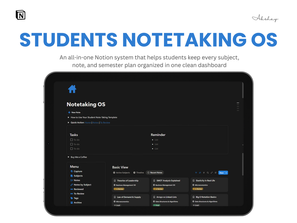 An all-in-one Notion system that helps students keep every subject, note, and semester plan organized in one clean dashboard. No more scattered notes or missed reviews β everything lives in one place.
