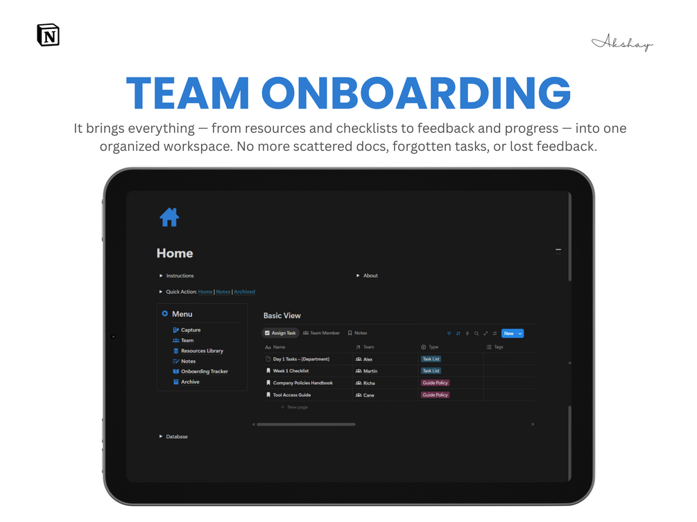 The Team Onboarding Tracker is a powerful Notion template designed to streamline the onboarding process for new team members. It brings everything โ€” from resources and checklists to feedback and progress โ€” into one organized workspace. No more scattered docs, forgotten tasks, or lost feedback.